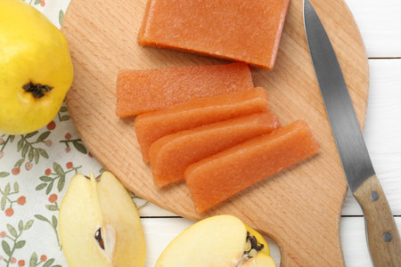 Tasty sweet quince paste, fresh fruits and knife on white wooden table, flat lay