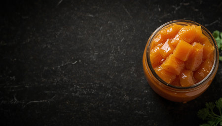 Closeup image of carrot jam in a glass jar with wooden spoon on blue background. Image with copy space, top view