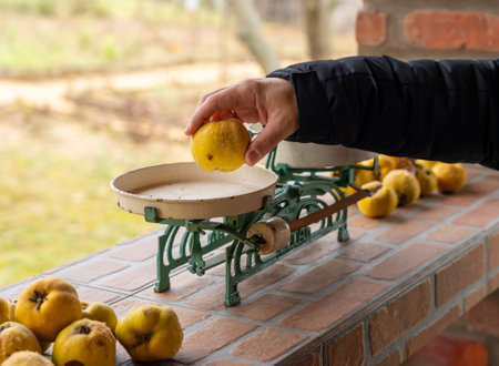 Weighing the harvest of quince on a small vintage scales by a male hand