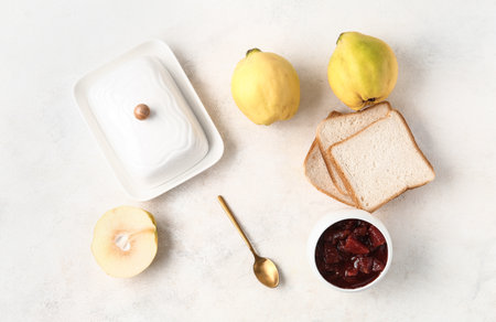Bowl of sweet jam, quince fruits and bread pieces on white table