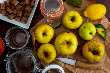 Ingredients to make jam and applesauce (yellow, reinetas). With sugar, lemon and glass jars.
