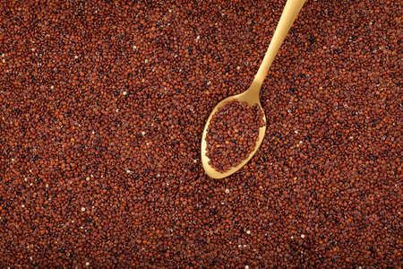 Organic Red Quinoa, dry groats in golden spoon, closeup. Design elements, copy space.