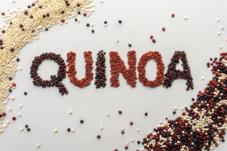 Quinoa and quinoa seeds forming the word quinoa on white background