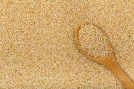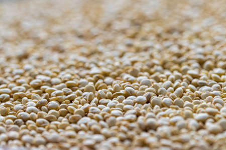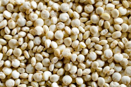 Uncooked white quinoa seeds background. Food texture.