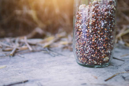 small jar with quinoa on rustic table top view. Healthy food and snack.