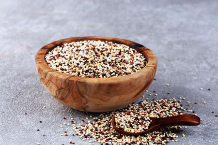 Raw mixed quinoa in bowl and scoop on light concrete background. Healthy and diet superfood
