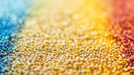 A striking close-up of colorful grains arranged in a rainbow spectrum showcases individual textures and vibrant colors, perfect for creative projects.