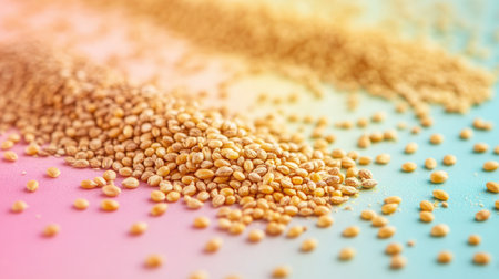 A creative digital illustration depicting High-end stock image of quinoa grains in starry field abstractions, multicolored speckles, vast dotted expanse, subtle twinkling light. This AI-generated artwork features unique visual elements suitable for various commercial and editorial applications. AI-generated illustration.