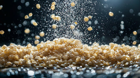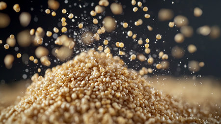 Quinoa groats are depicted mid air showcasing their individual shapes and textures dark background creating inviting and organic visual.