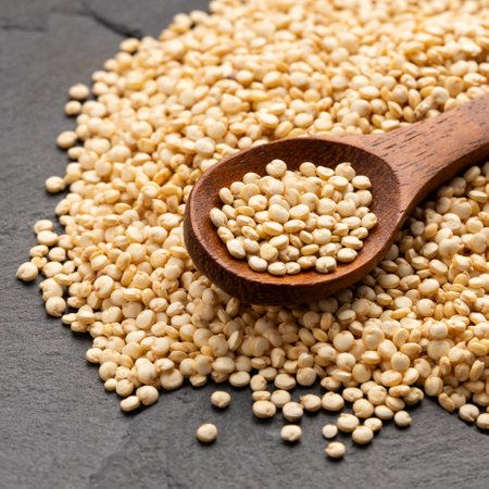 A closeup shot showcases a pile of raw white quinoa seeds scattered across a dark, textured surface. The image highlights the natural beauty and texture of this healthy grain.