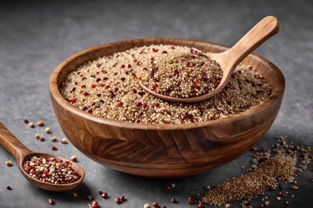 Close-up of tricolor quinoa grains in a rustic wooden bowl with a spoon, featuring a mix of white, red, and black quinoa on a textured gray surface