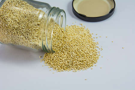 Organic Quinoa in jar on white background.