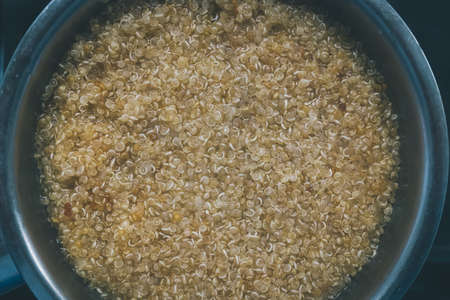 Pot cooking quinoa grains viewed from above, faded colors and film grain added.