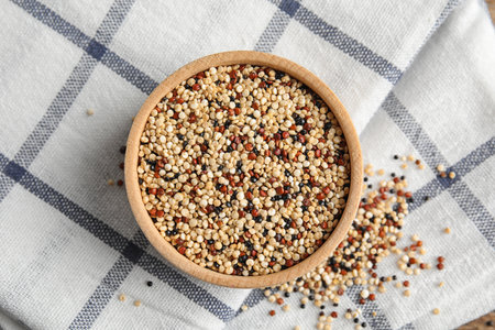 Bowl with mixed quinoa seeds on cloth, top view