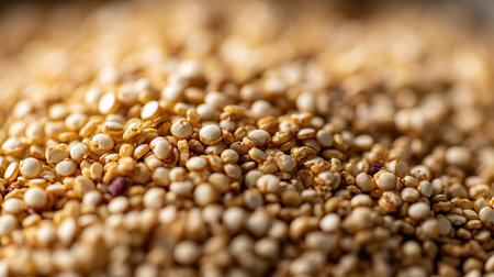This macro image highlights a mound of golden quinoa grains. Close inspection reveals its texture and unique white germ. Ready to prepare a healthy vegan meal.