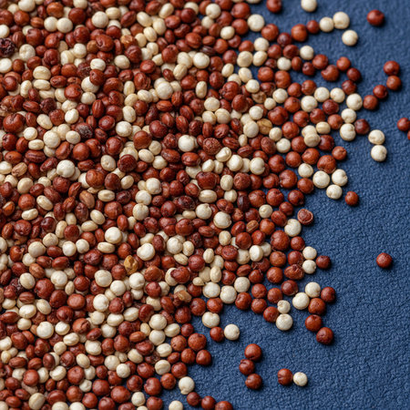 Red, white and black quinoa seeds on blue textured background
