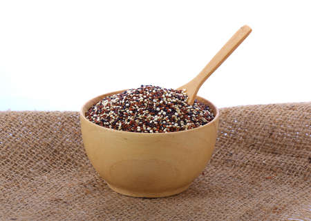 Quinoa in a wooden spoon on white background