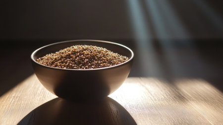 A serene image showcasing a bowl filled with grains, beautifully illuminated by sunlight streaming through a window, highlighting texture and warmth.