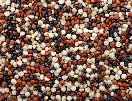 Mixed uncooked quinoa seeds. Top view.