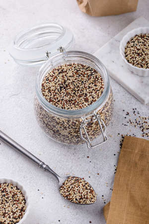 Raw quinoa grains in jar. Healthy vegetarian food on gray kitchen table. Selective focus.