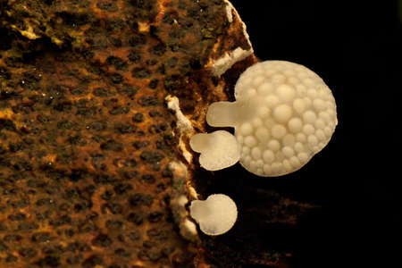 Low key and Macro photo of fresh yellow mushroom growing in the cracks of the wood rotting. Another name of the mushroom is toadstool. Mushroom are categories: Fungi.