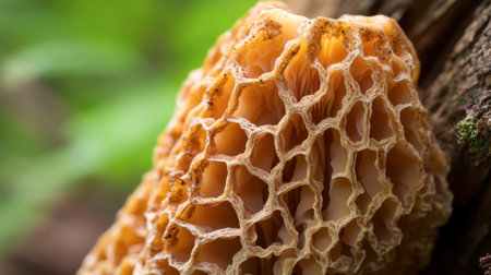 A detailed close-up of the unique pattern on a morel mushroom's honeycomb-like cap, with soft sunlight highlighting its texture.