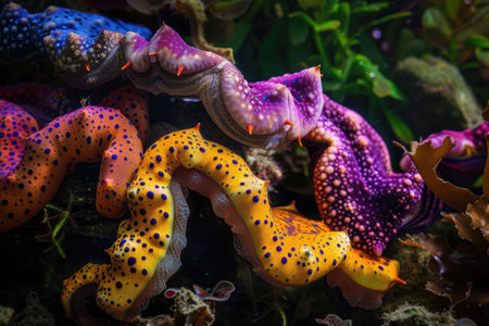 A cluster of colorful deep-sea sea cucumbers resting on the ocean floor