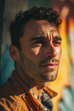 Vibrant portrait of a smiling man in colorful outfit against abstract background