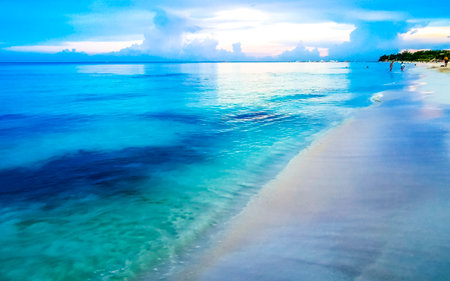 Tropical Mexican Caribbean beach landscape panorama with clear turquoise blue water resorts and palm trees in Playa del Carmen Mexico.
