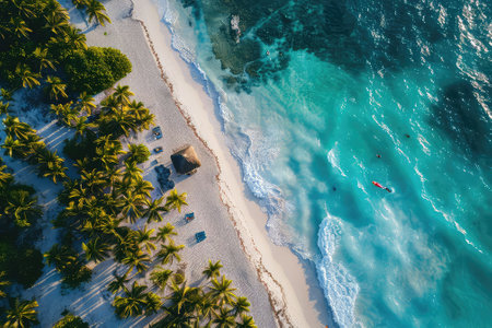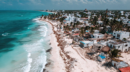An aerial perspective showcases a coastal scene. Turquoise water crashes onto a sandy beach, bordered by a strip of land containing buildings and vegetation. The image features natural light and a composition suitable for various commercial or editorial applications, offering a sense of place.