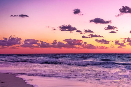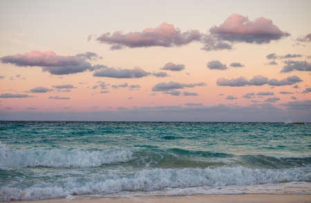 Gentle Sunrise on the coast of the Atlantic Ocean. Seascape with turquoise waves of the sea and pink hues on a rassset on a tourist beach. Relaxing holidays by the sea at the magical sunset of Varadero