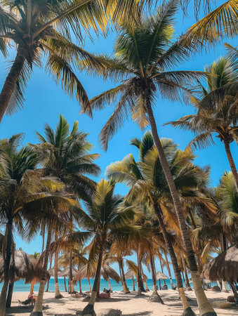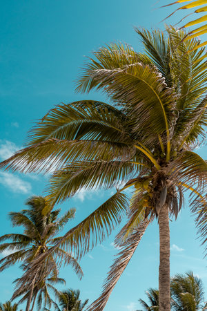 Palm tree stands tall on Mexican beach in summer. Blue sky with white clouds provides beautiful backdrop for green palm. Coconut trees sway gently in breeze, adding to tropical atmosphere.