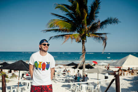 Playa del Carmen April 17, 2021 Tropical mexican beach landscape panorama full of people at beach parties on vacation in Playa del Carmen Mexico.