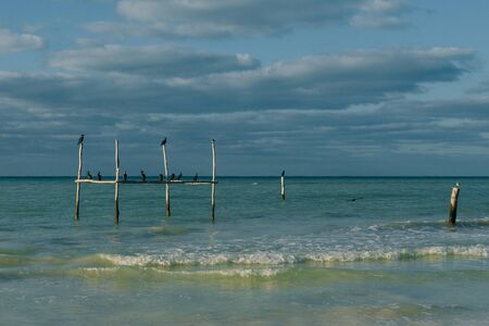 Pelicans and seagulls perch on wooden pillars on the shores of Riviera Maya beach in Cancun, Mexico.