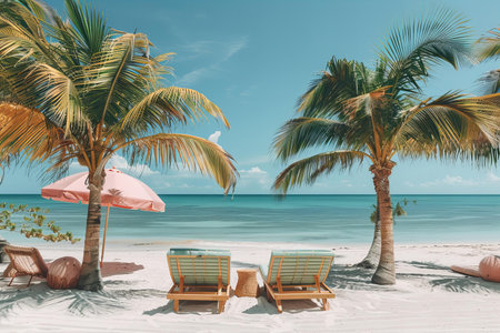 Pair of sitting chairs on the beach with palm trees and a umbrella