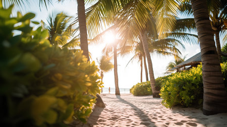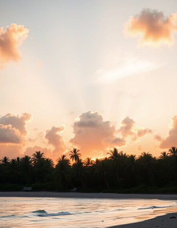 Tranquil sunset over tropical coastline, palm trees sway in breeze generated by artificial intelligence