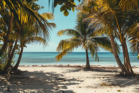 A palm tree stands on the sandy beach near the vast ocean, under a clear blue sky with fluffy clouds, adding to the beautiful coastal natural landscape AIG50