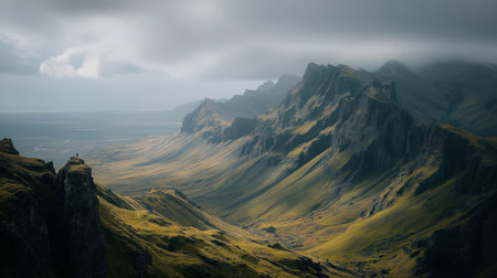 Lush green Icelandic valley with rugged mountains under a cloudy sky. Icelandic valley with impressive green mountains and dramatic sky