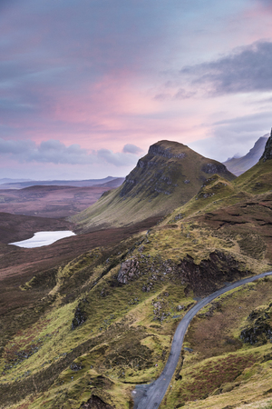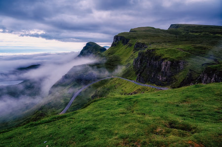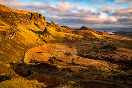 Long winding road at Quiraing on the Isle of Skye with a beautiful vibrant scottish sky.