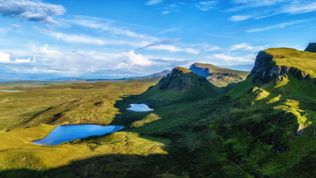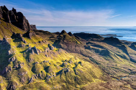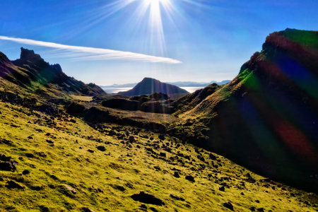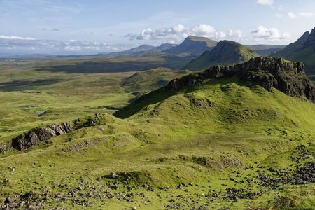 Sunny morning in Quiraing mountains. Hilly landscape of Isle of Skye, Scottish Highlands. Breathtaking view