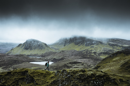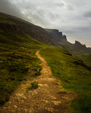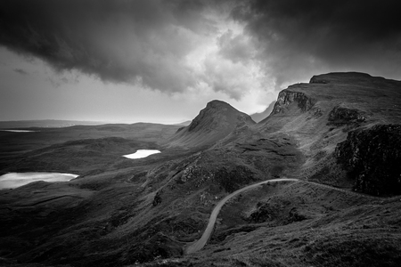 Moody rain clouds over popular travel destination; The Quiraing on the Isle of Skye, Scotland, UK. Scenic Scottish landscapes in the wilderness.