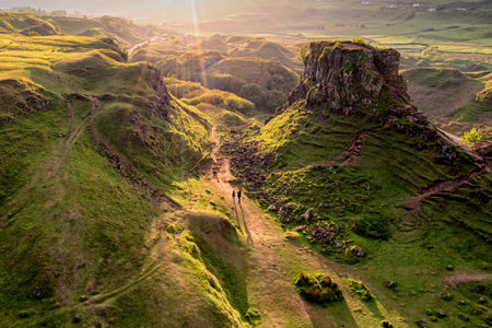 Drone view of Quiraing mountains in Isle of Skye, Scottish highlands, United Kingdom.
