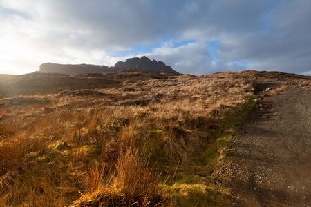 Winter colors of hilly landscape on the Isle of Skye in Scotland. Beautiful Quiraing range of mountains within sunny February day
