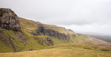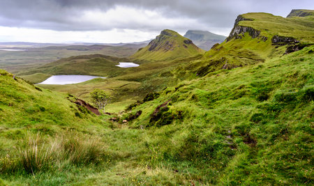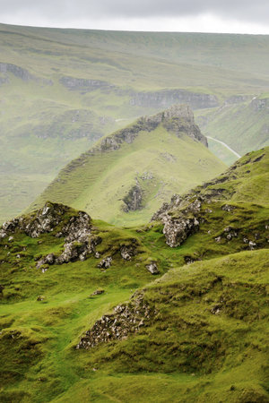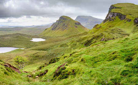 Landscape view of Quiraing mountains on Isle of Skye, Scottish highlands, Scotland, United Kingdom