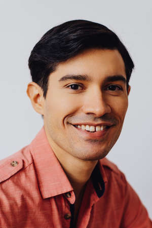 Headshot hispanic latino man black hair smiling handsome young adult wearing melon shirt over gray background looking at camera