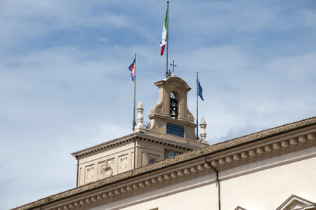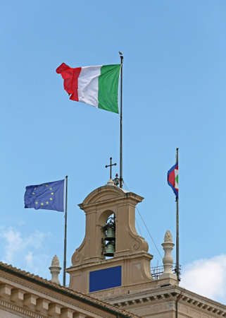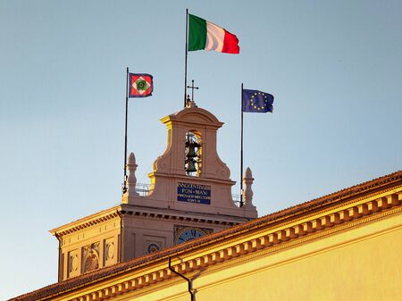 The bell tower of the Palazzo del Quirinale in Rome, residence of the head of state. The Italian flag flies alongside the European and at presidential Banner