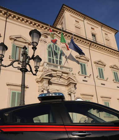 Rome, RM, Italy - March 3, 2019: car of Italian police called Carabinieri with sirens near the Qurinal Palace and the flags