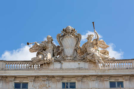 Pope Clement XII (Corsini Family) emblem between angels with trumpets in Quirinale Square in Rome, designed by architect Ferdinando Fuga in the 18th century