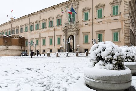 Rome, Italy - February 26, 2018: An exceptional weather event causes a cold and cold air across Europe, including Italy. Snow comes in the capital, covering streets and monuments of a white white coat. In the photo, Piazza del Quirinale, home of the Presi