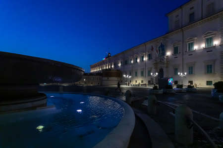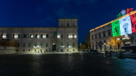 Rome, Italy - April 7, 2020: Piazza del Quirinale in the evening in the blue hour, illuminated with the colors of the Italian flag, visible on the Palazzo della Consulta.